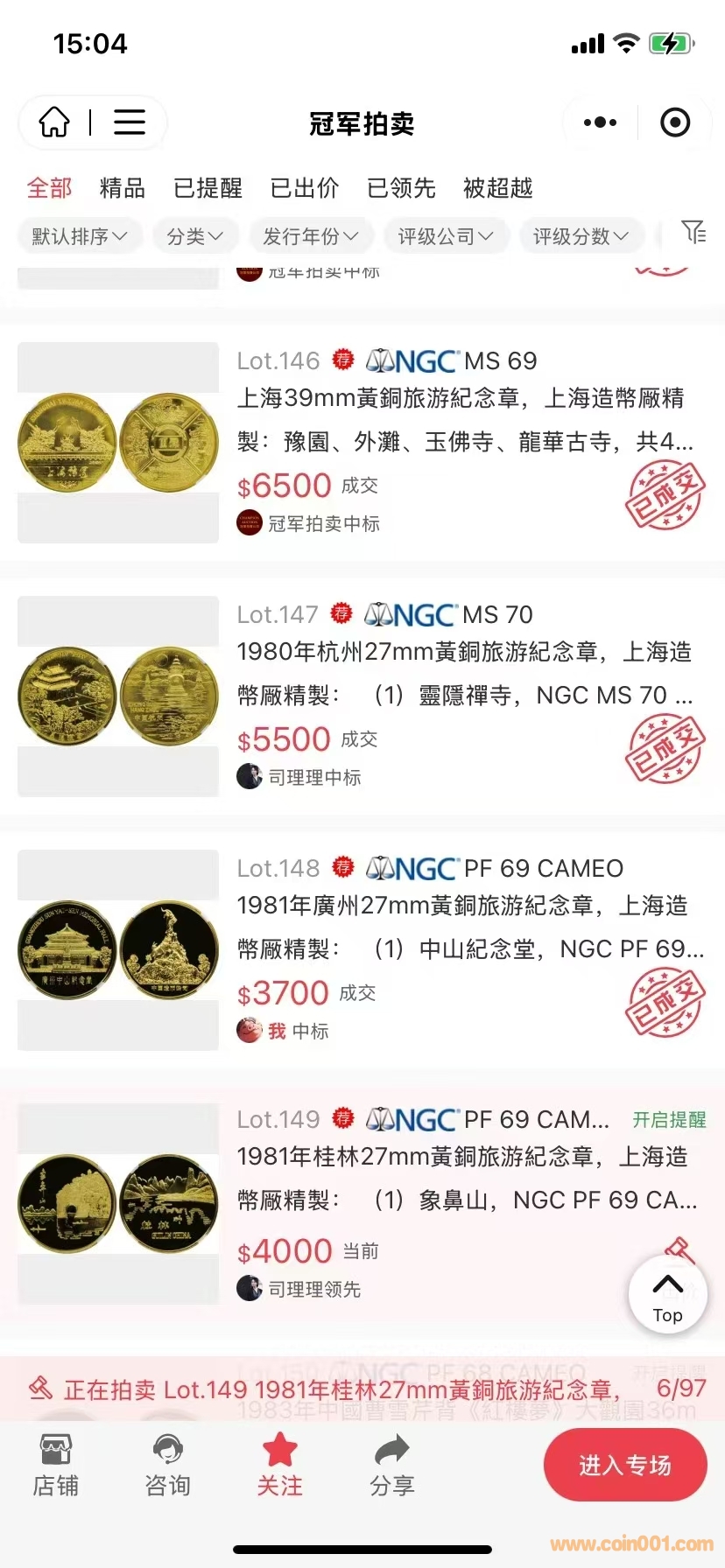 這次澳門拍賣征集了許多精品章,4枚MS69的上海風(fēng)景、2枚MS70及2枚MS69的杭州風(fēng)景、3枚69CA與70UC的廣州風(fēng)景、3枚69CA與一枚70CA的桂林山水。