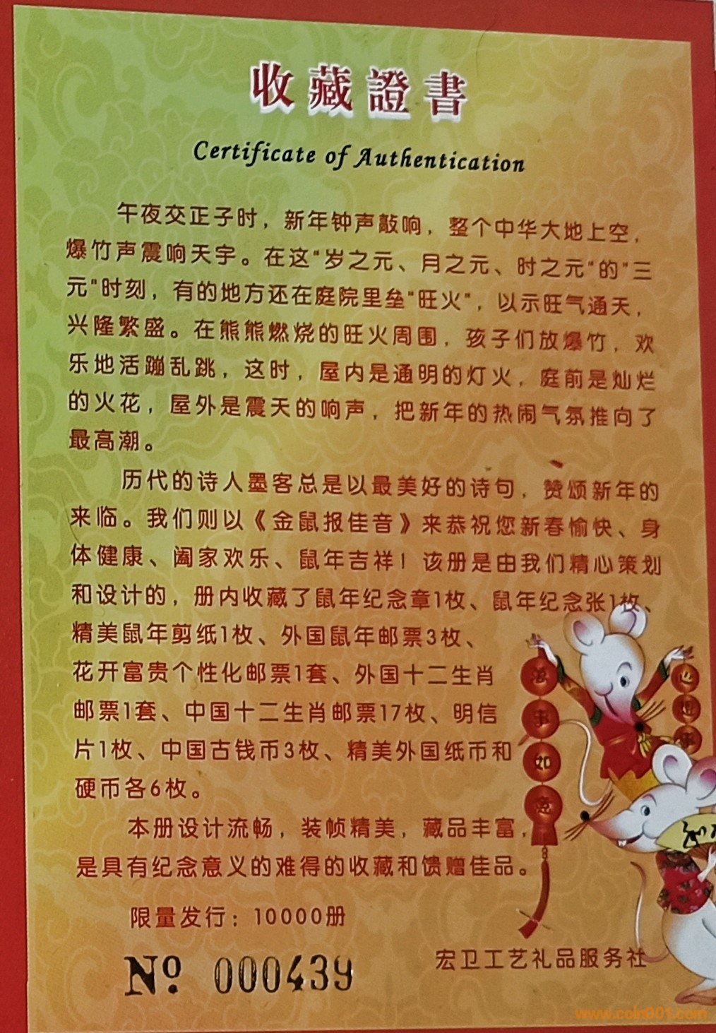 這紀(jì)念冊(cè)是2008年鼠年定制的紀(jì)念冊(cè),共一萬(wàn)套,我這冊(cè)編號(hào)00439,收藏證書(shū)如下: